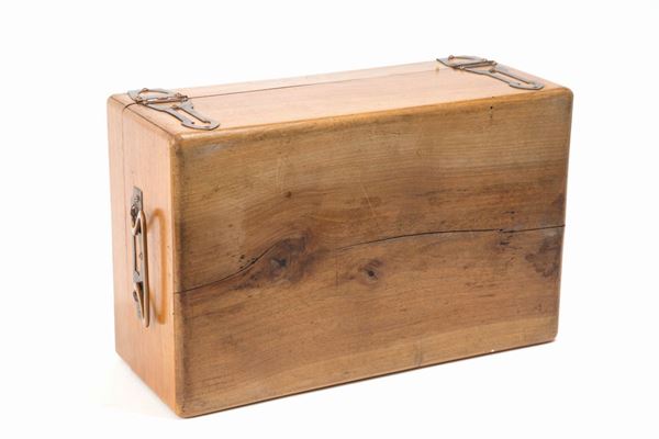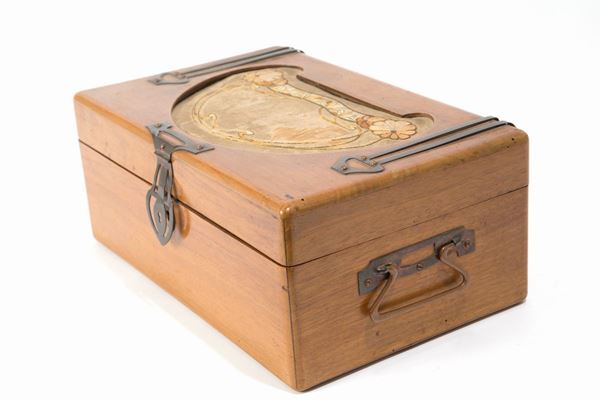 Cofanetto in legno di noce e ottone con al centro piccolo punto. Periodo Liberty. Mancante di una maniglia.