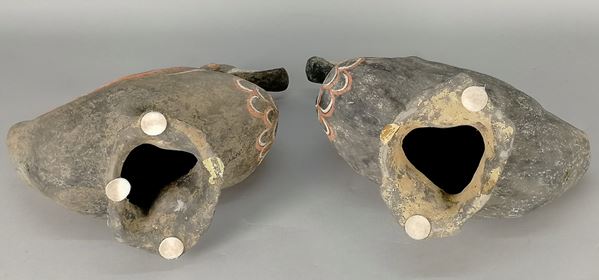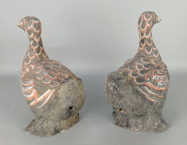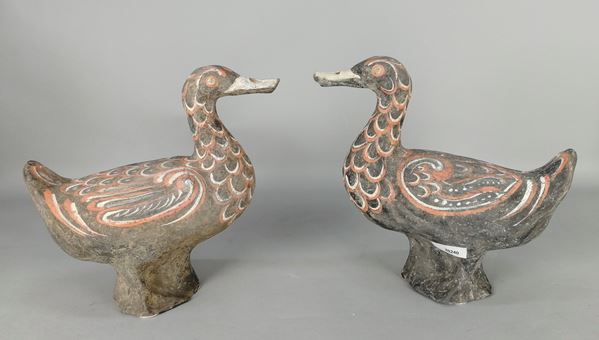 Coppia di anatre in ceramica policroma. Tecnica grana fine. Cina. Dinastia Han (206 a.C. - 220 d.C).