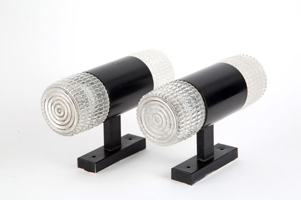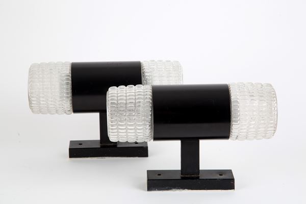 Coppia di applique cilindriche in vetro spesso lavorato con supporti in metallo verniciato nero. Manifattura italiana. Anni '70.