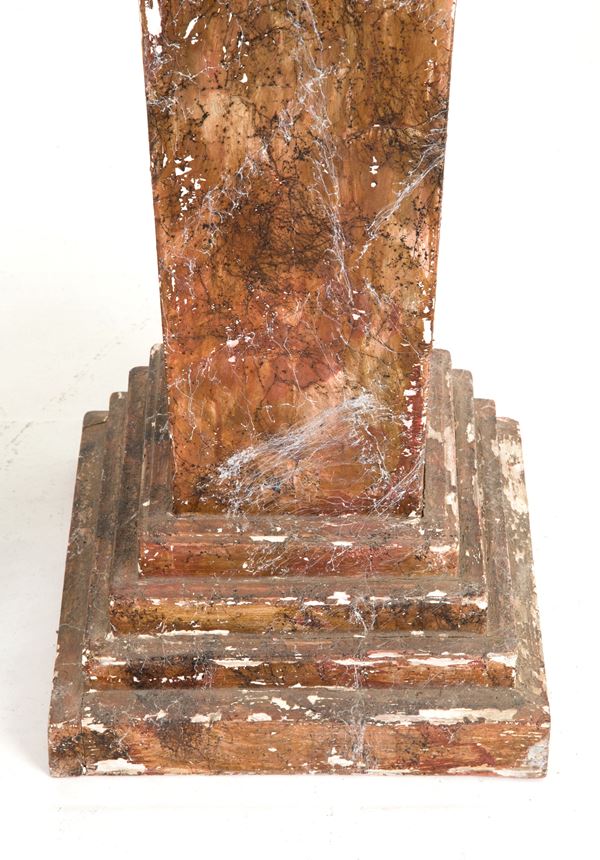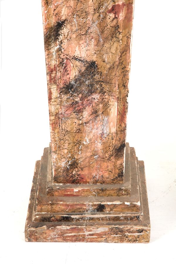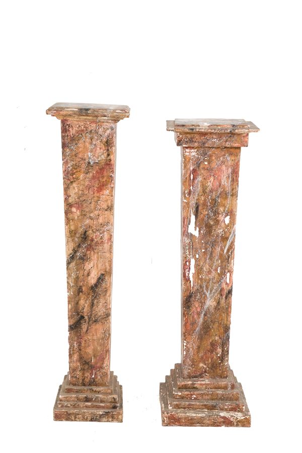 Coppia di colonne in legno laccato a finto marmo. XX secolo. Difetti e mancanze.
