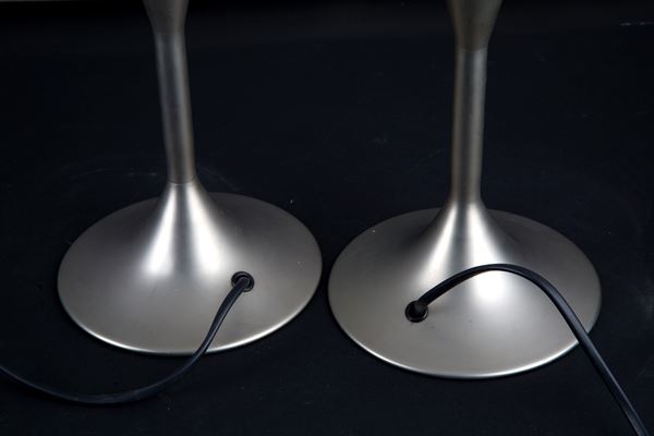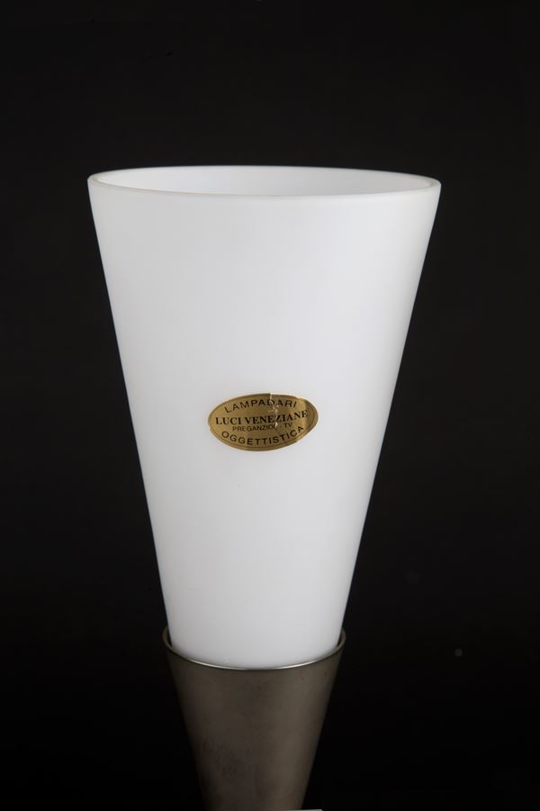 Coppia di lampade in metallo con diffusore conico in vetro bianco satinato. Produzione LUCI VENEZIANE, Preganziol (TV). Anni '70. Con etichetta del produttore.