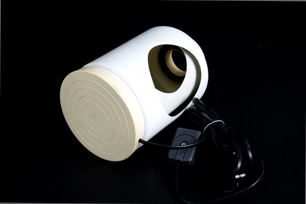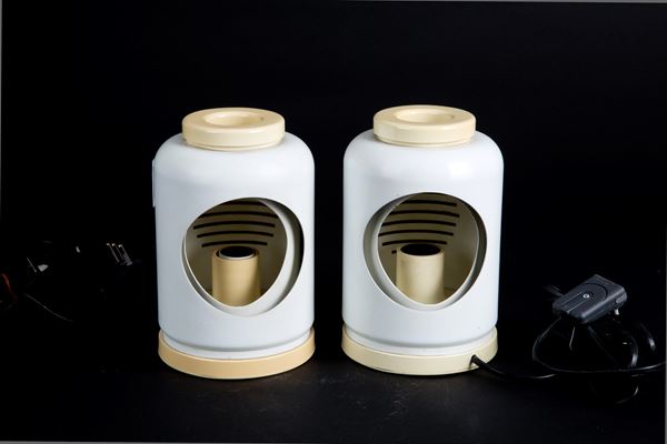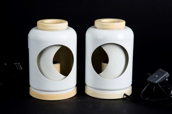 Coppia di lampade da tavolo in metallo laccato bianco con profili gialli composte da due elementi di cui uno interno girevole. Anni '70-'80.
