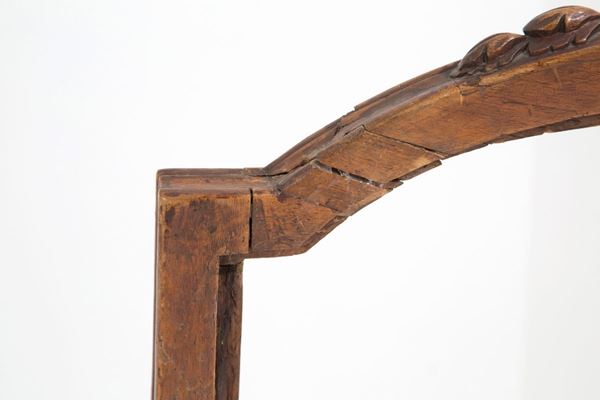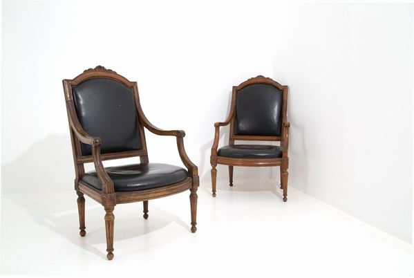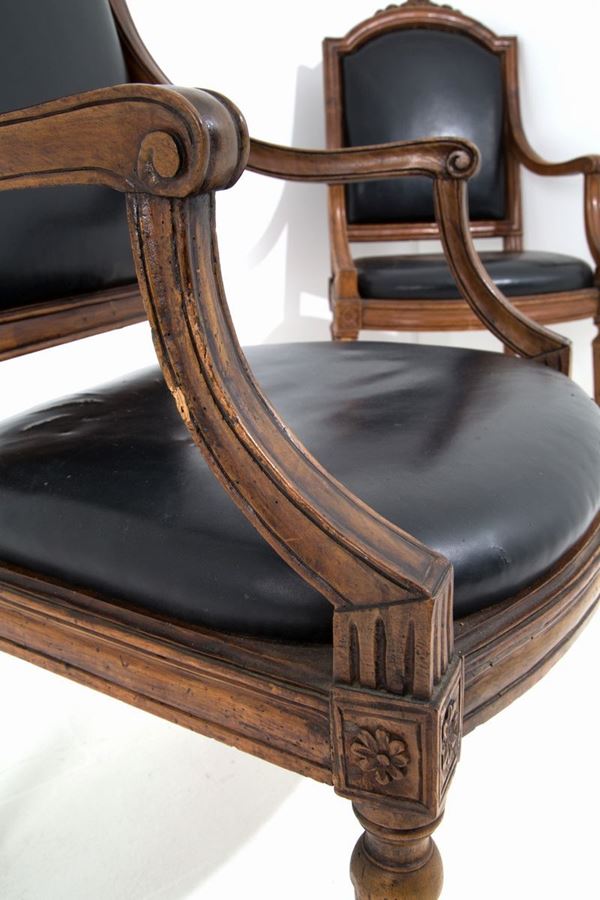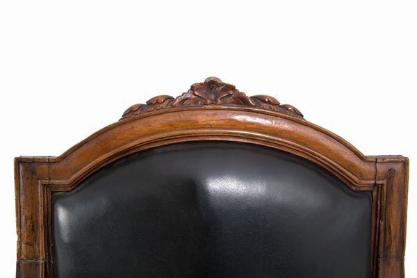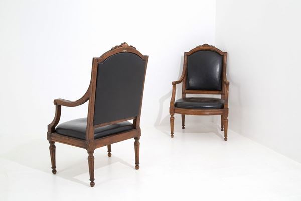 Coppia di poltrone in legno di noce finemente intagliato con schienale e seduta imbottiti. Genova. Fine XVIII secolo.