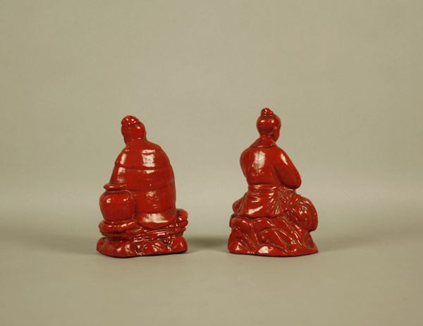 Coppia di sculture in lacca rossa raffiguranti ''PERSONAGGI''. Cina. Inizi XIX secolo.