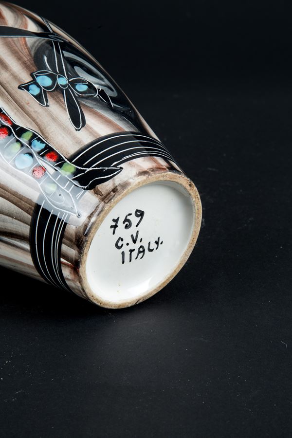 Vaso in ceramica con decoro policromo raffigurante "RAGAZZA CHE FUMA". Marcato C.V. 759 sul fondo.