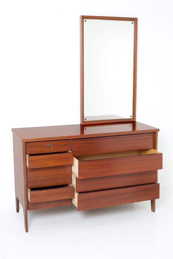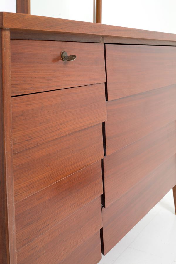 Comò a dieci cassetti in legno di teak con specchiera. Anni '60. Difetti e segni di usura del tempo.
