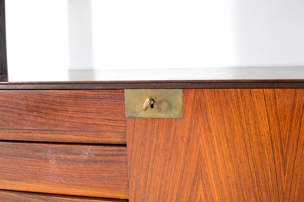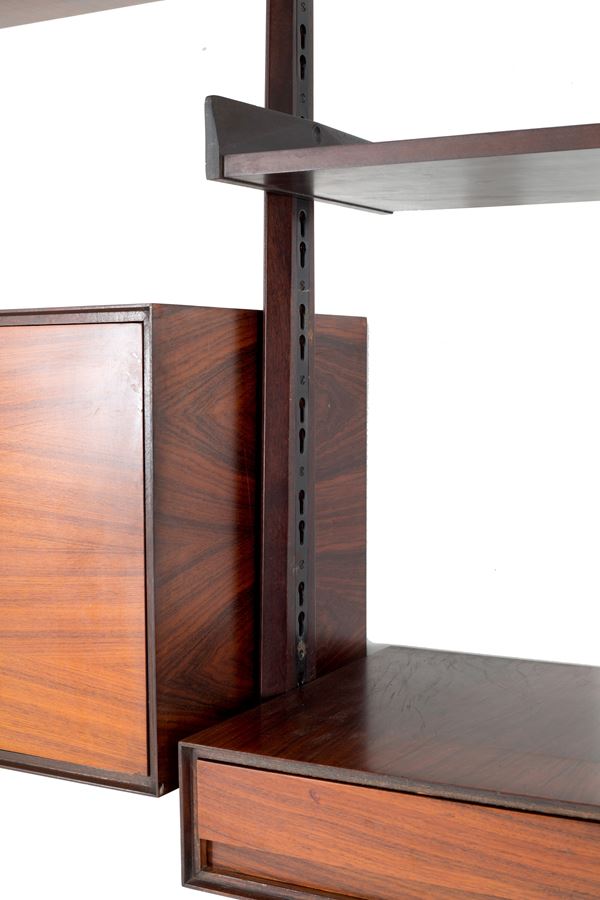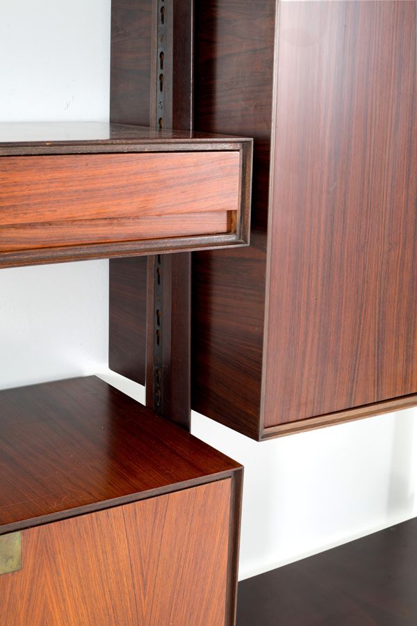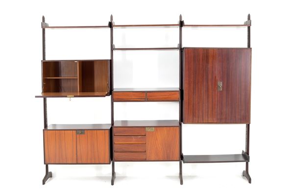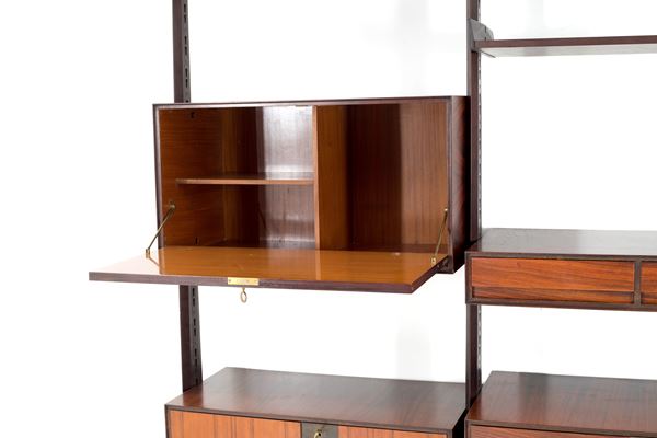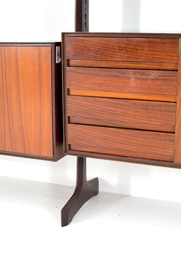 Libreria autoportante in legno di teak e guarnizioni in ottone con quattro montanti e cinque elementi modulari disponibili a proprio gusto.