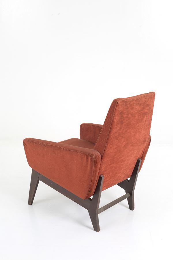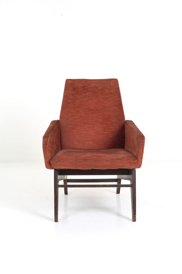 Poltrona in legno di teak e velluto color mattone. Anni '60. Segni di usura del tempo.