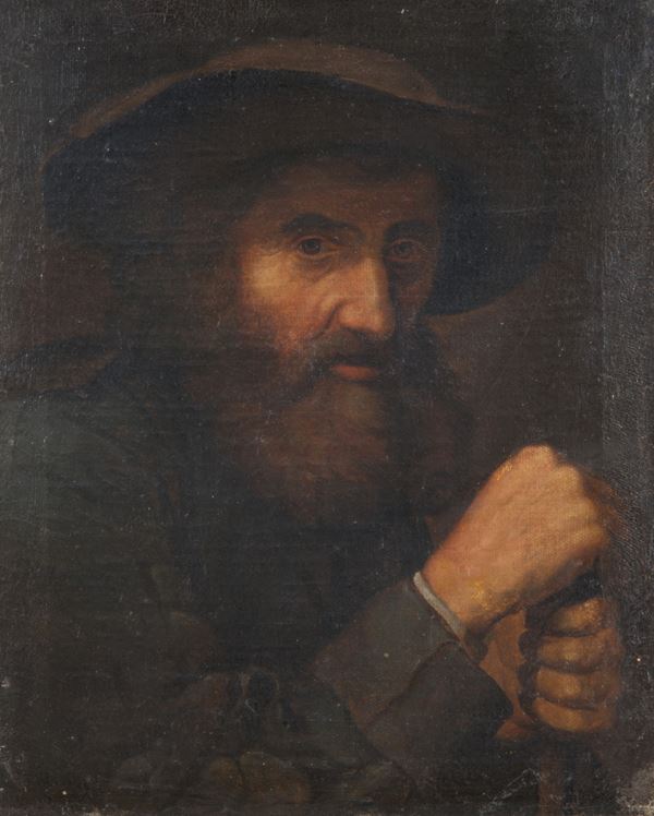 Dipinto olio su tela raffigurante "TESTA DI VECCHIO CON BARBA E CAPPELLO". XVII secolo. In cornice. Difetti e restauri. Già rintelato e rintelaiato.
