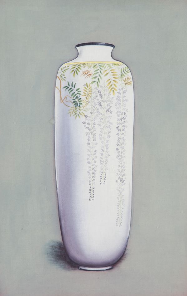 Dipinto tempera su stoffa raffigurante "VASO CINESE". XX secolo. In cornice.
