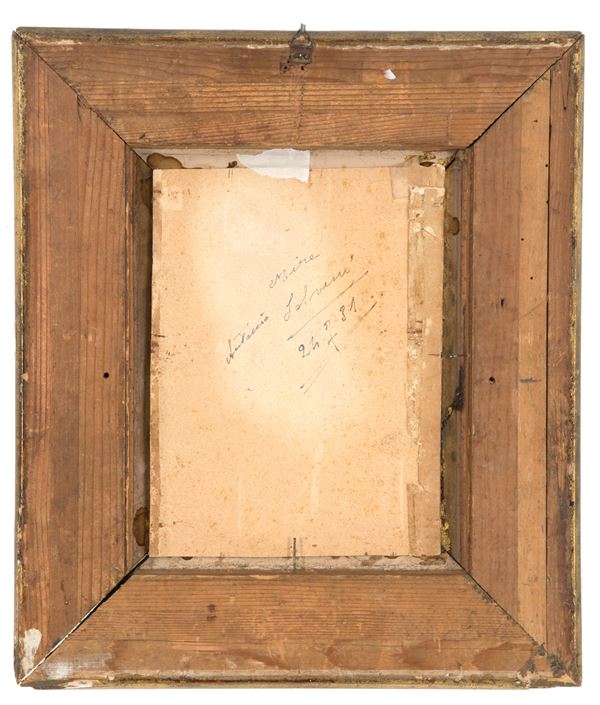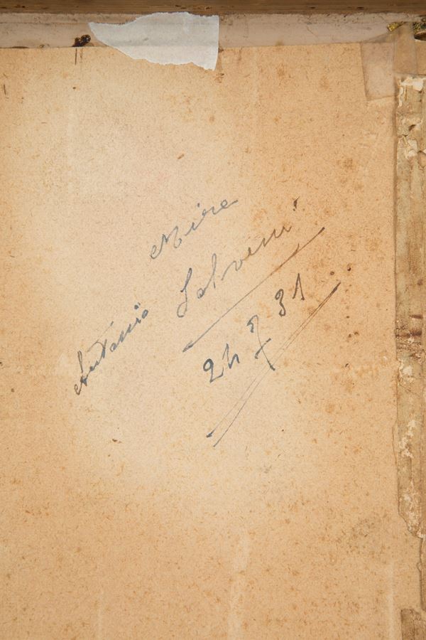 Tecnica mista su carta raffigurante ''BIMBO CON UCCELLINO IN MANO''. Firmata in basso a destra. Con scritta 'A mia attribuizione... Giacomo Fav... opera giovanile. In fede, Alessandro Milesi, ottobre 1939' in basso al centro e 'Antonio Salvemi, 24-7-31' sul retro. In cornice.