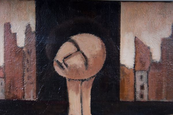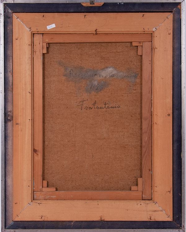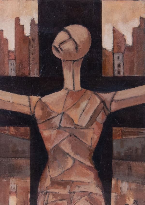 Dipinto olio su tela raffigurante ''MANICHINO IN CROCE''. Firmato e datato 1971 in basso a destra. In cornice.