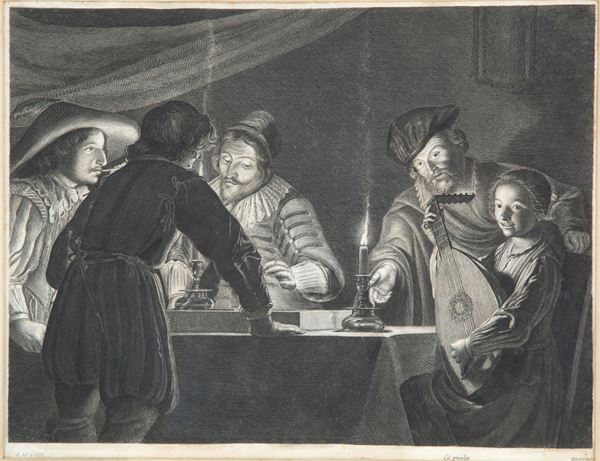 Incisione "GIOCATORI DI TRIC-TRAC A LUME DI CANDELA"