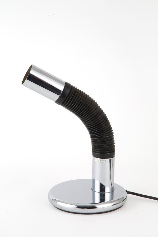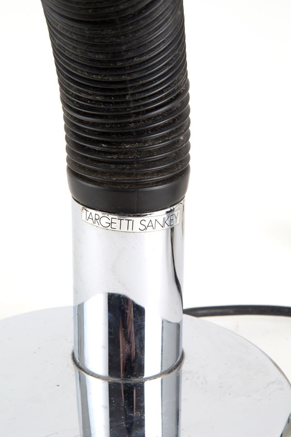 Lampada da tavolo Brendy in acciaio cromato con elemento flessibile nero. Produzione TARGETTI SANKEY. Con etichetta del produttori. Anni '70.