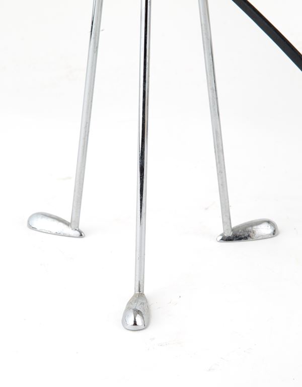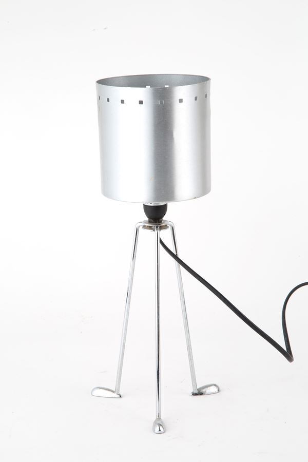 Lampada da tavolo in metallo a tre piedi con diffusore in alluminio satinato. Anni '70.