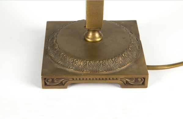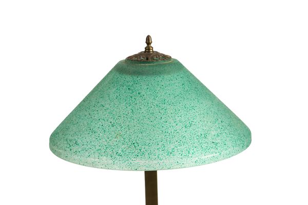 Lampada da tavolo in ottone brunito con diffusore in vetro macchiettato verde. Anni '50.