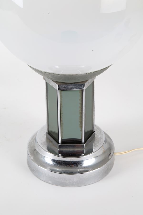 Lampada da tavolo a forma di lampioncino in acciaio cromato e specchi con diffusore in vetro. Produzione TARGETTI SANKEY. Con etichetta del produttore. Anni '70.