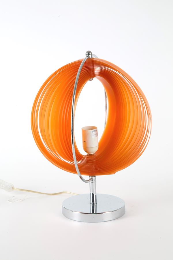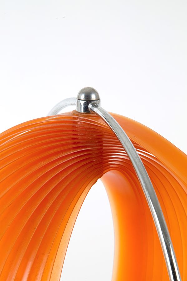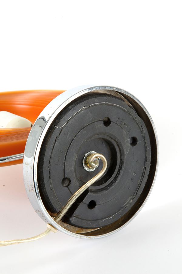 Lampada in acciaio con paralume in materiale plastico arancione. Anni '80.