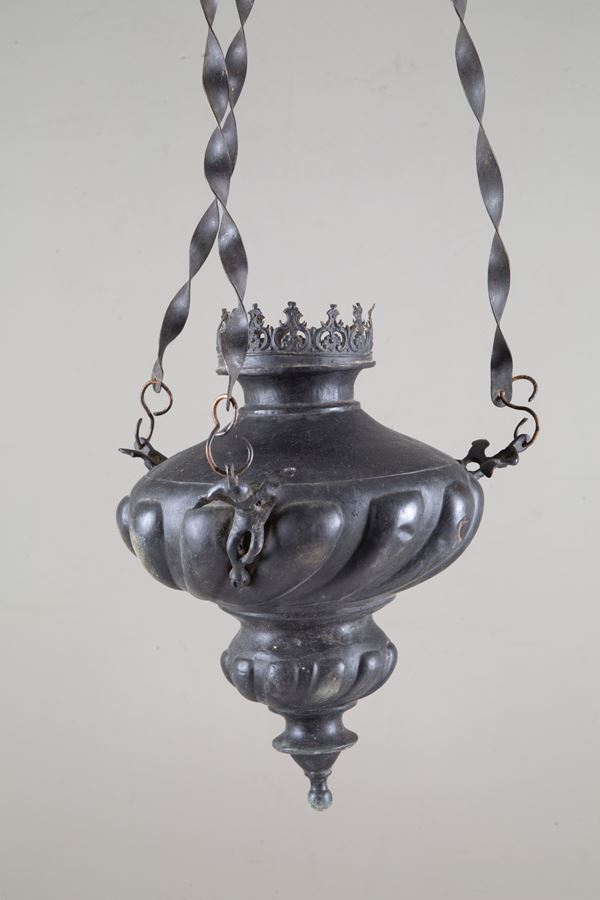 Lampada votiva in bronzo. XIX secolo. Difetti.