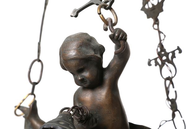 Lampadario in bronzo con putti. Inizi XX secolo. Difetti e mancanze.