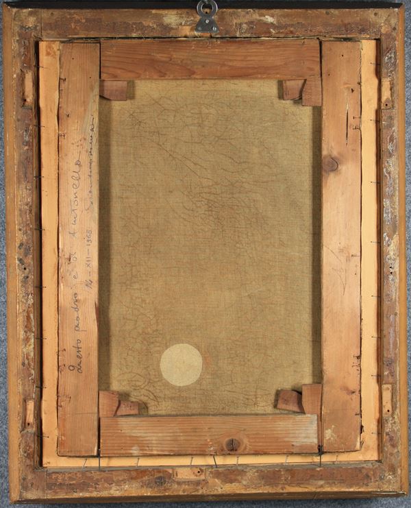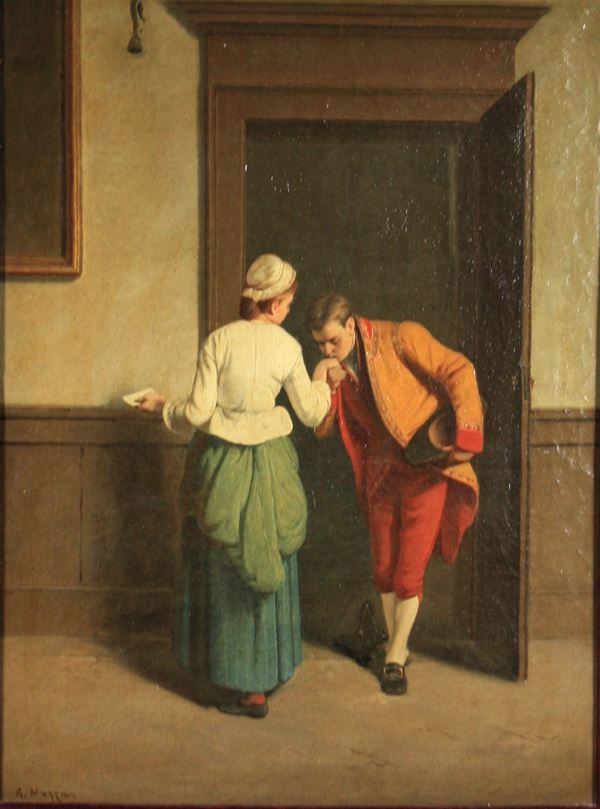 Dipinto olio su tela raffigurante ''SCENA GALANTE''. Firmato in basso a sinistra. In cornice. Difetti e restauri.