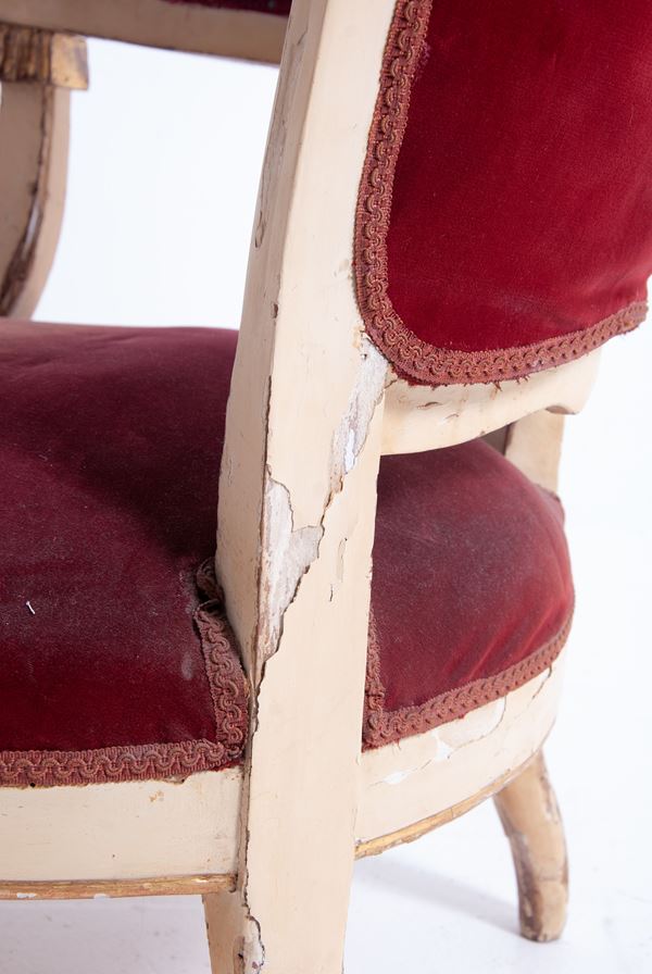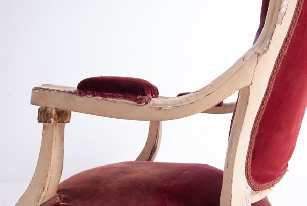 Poltrona in legno laccato foderata in velluto rosso. Genova. Periodo Luigi Filippo. Difetti.