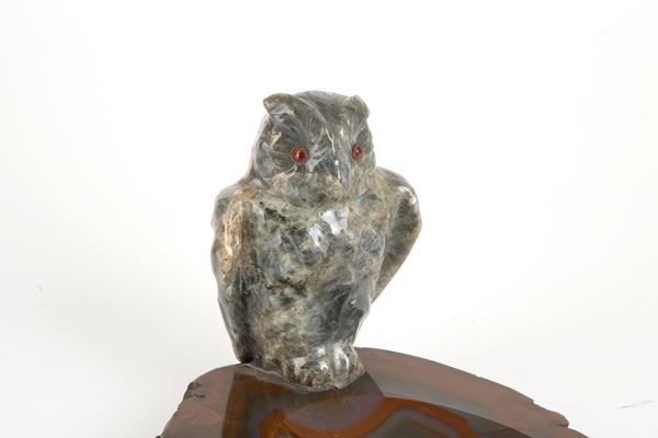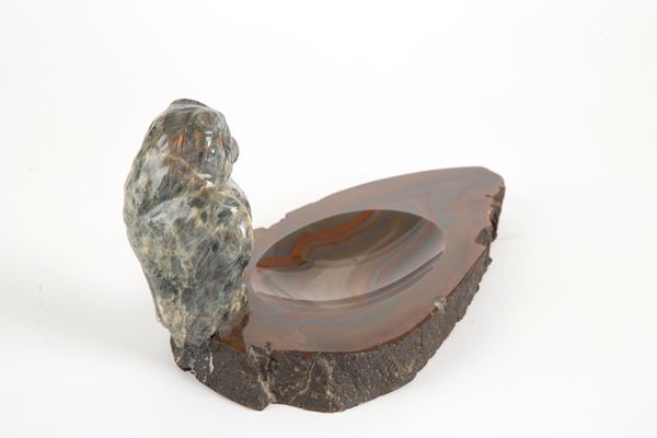 Posacenere in pietra dura decorato con un gufo. XX secolo. Lievi difetti.