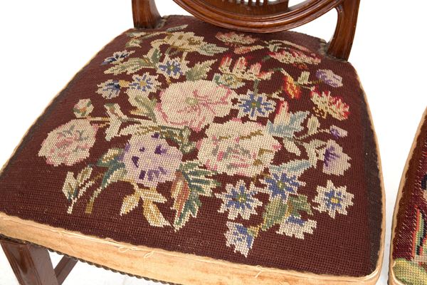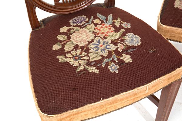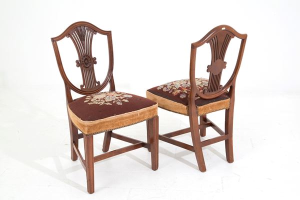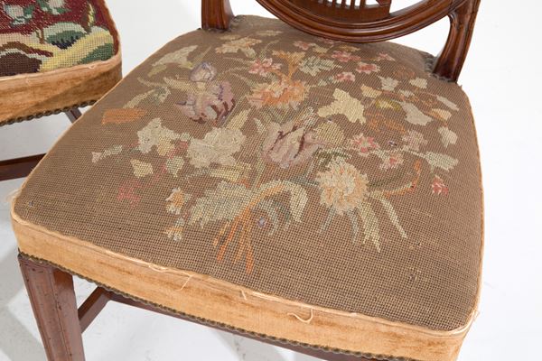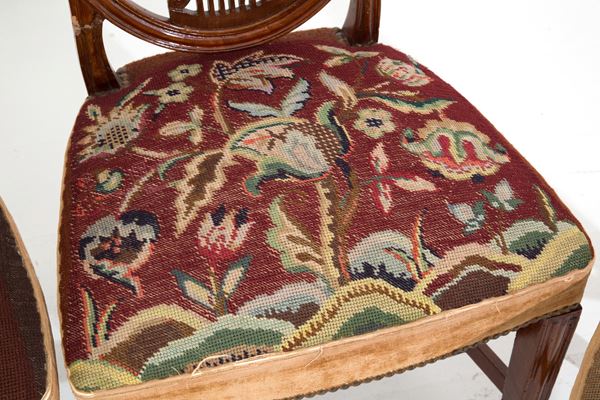 Quattro sedie in mogano con schienali a cartella traforata e seduta in tessuto a piccolo punto decorato a motivi floreali. Inghilterra. Fine XIX secolo.