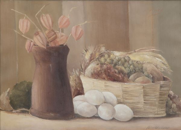 Dipinto olio su tela raffigurante "NATURA MORTA". Firmato in basso a destra. Controfirmato sul retro. In cornice.