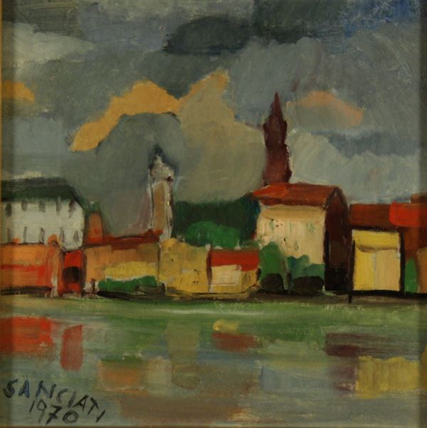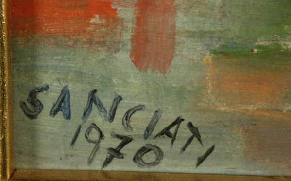 Dipinto olio su masonite raffigurante ''PAESAGGIO''. Firmato e datato 1970 in basso a sinistra. In cornice laccata.