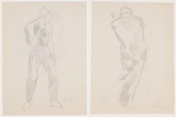 Due disegni a matita su carta raffiguranti "STUDI PER PERSONAGGI TEATRALI". Firmati e data '57 in basso a destra. In cornice.