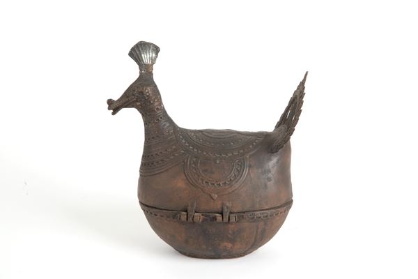 Scatola in bronzo a forma di pavone. India. XX secolo.