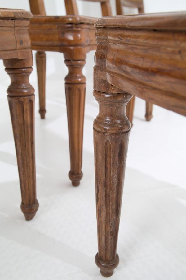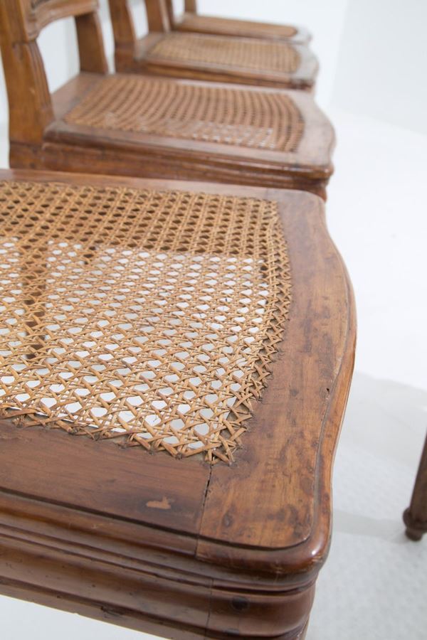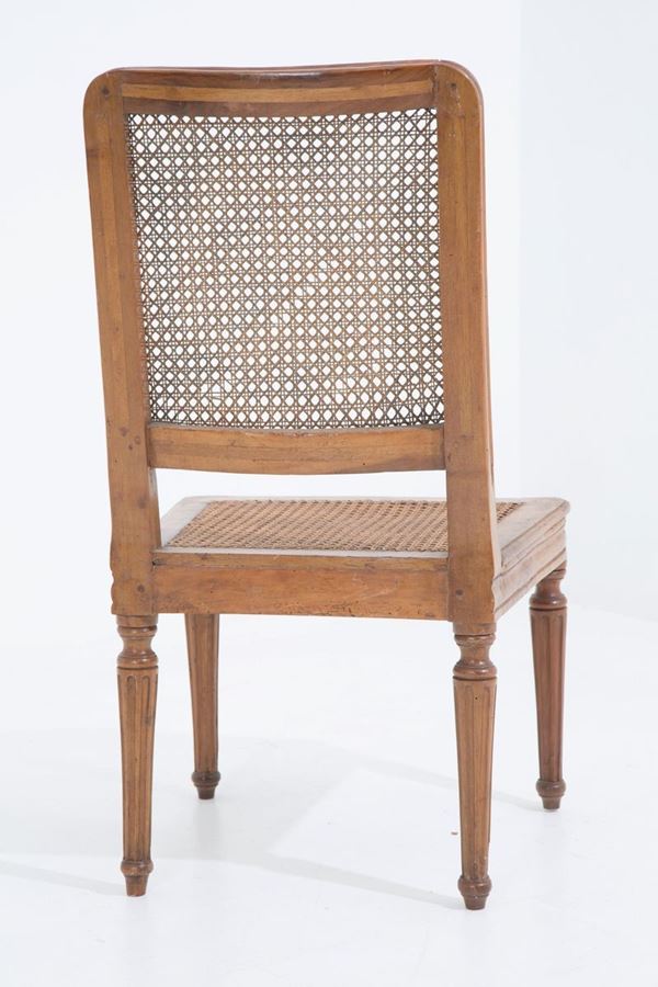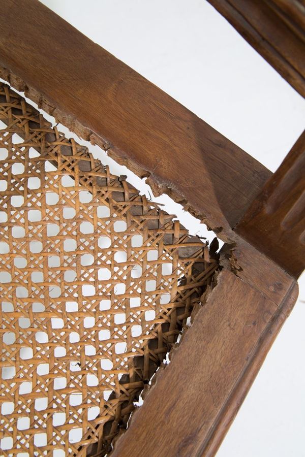 Sei sedie in legno di noce con seduta e schienale in paglia di Vienna. Genova. Fine XVIII secolo. Difetti.