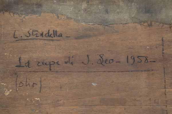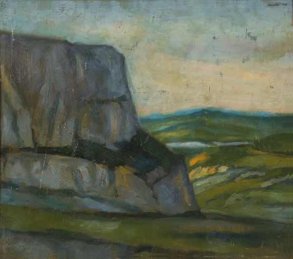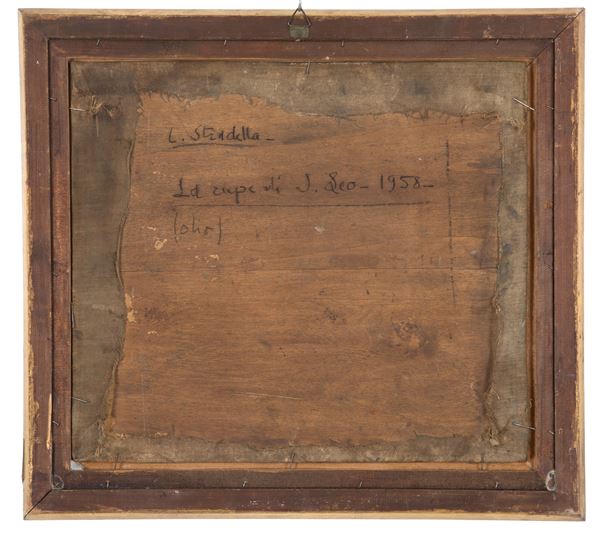 Dipinto olio su tela applicata su tavola intitolato "LA RUPE DI SAN LEO". Firmato e datato 1958 in alto a destra. Controfirmato, datato e intitolato sul retro. In cornice. Lievissimi difetti.