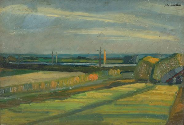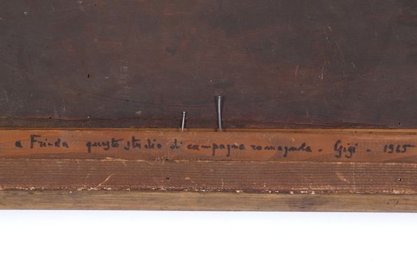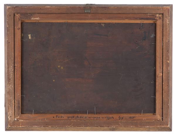Dipinto olio su tavola raffigurante "PAESAGGIO ROMAGNOLO". Firmato in alto a destra. Con dedica sul retro del 1965. In cornice.