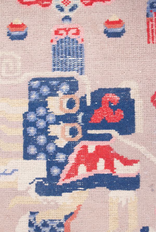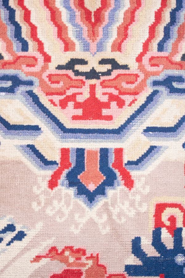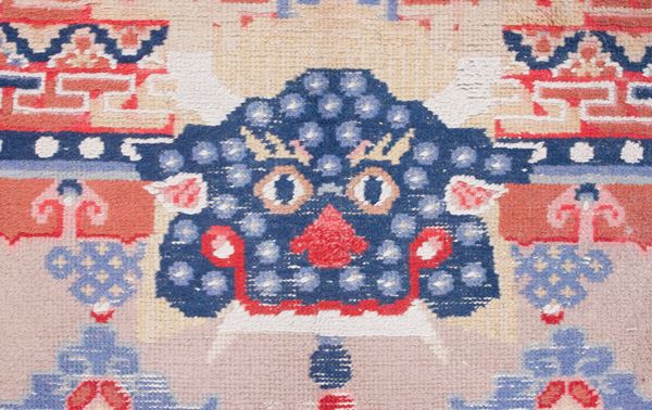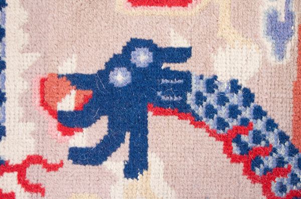 Tappeto disegno a draghi. Tibet. Prima metà del XX secolo. Buono stato di conservazione. I lati perimetrali sani e originali, piccoli punti sul campo e usure del tempo.