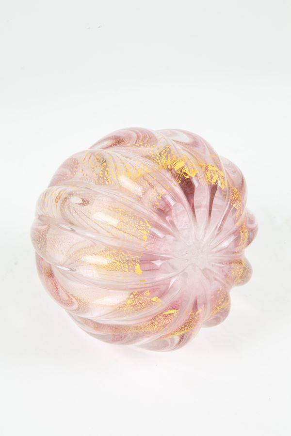 Vaso in vetro color rosa antico con inclusione a foglia d'oro. Produzione BAROVIER (Attr.).