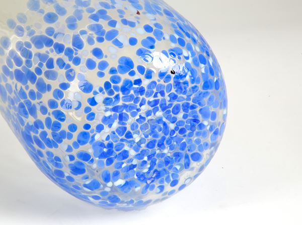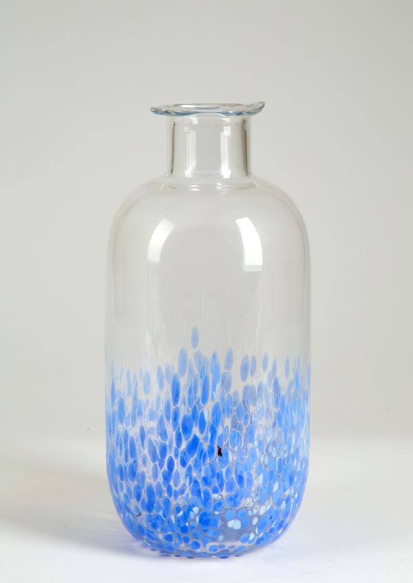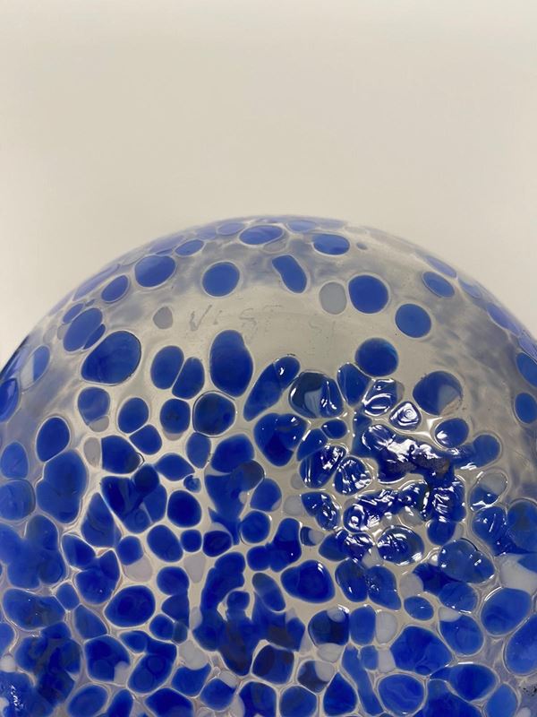 Vaso in vetro trasparente con murrine celesti. Firmato sul fondo.