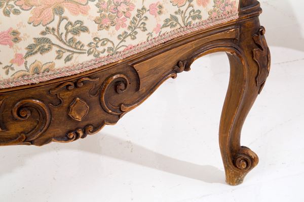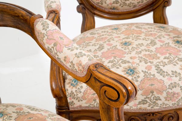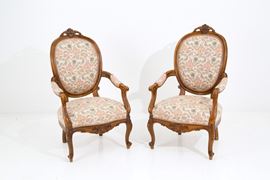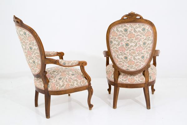 Coppia di poltrone in legno intagliato e traforato a motivi floreali. Periodo Luigi Filippo. Difetti.