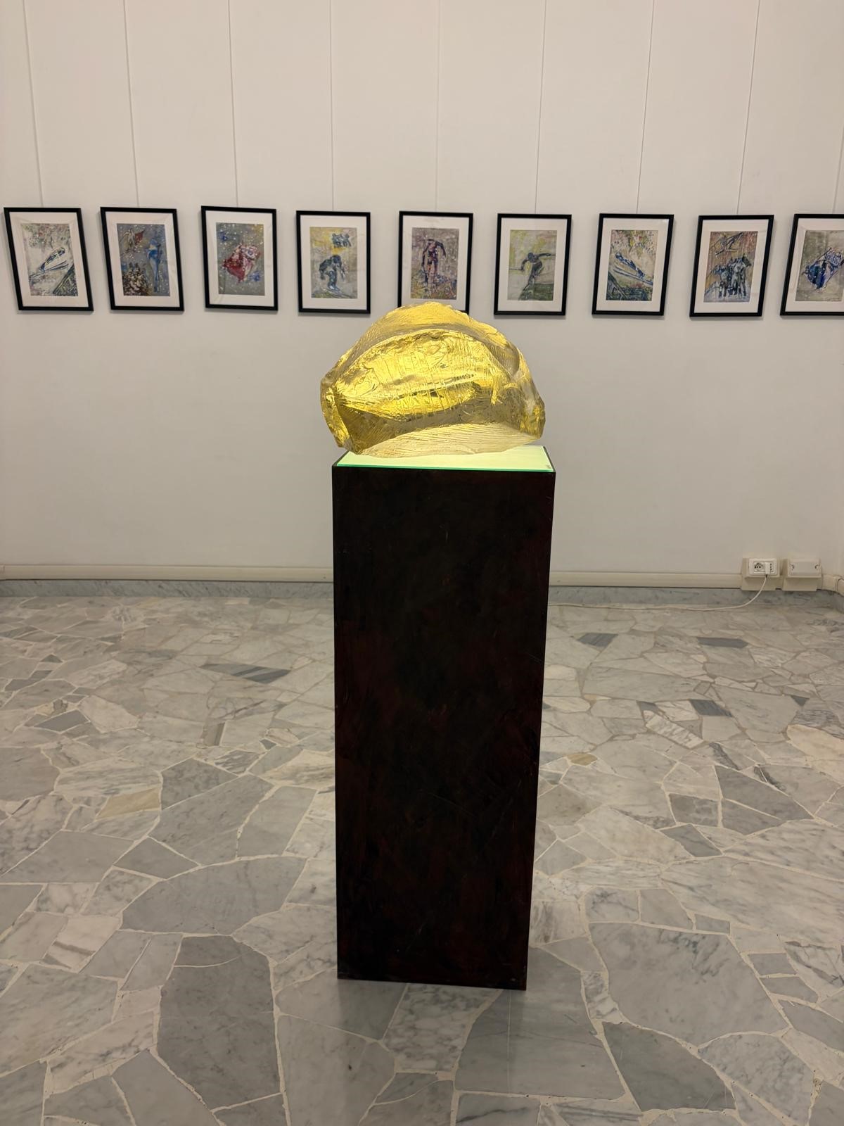 Scultura modello Fiamma Olimpica in vetro su plinto luminoso in acciaio patinato.