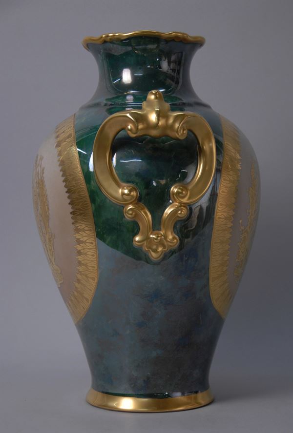 Vaso in porcellana policroma con finiture in oro zecchino. Firmato THOMAS BAVARIA sotto la base. Germania. XX secolo.