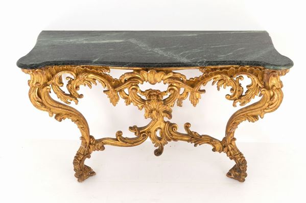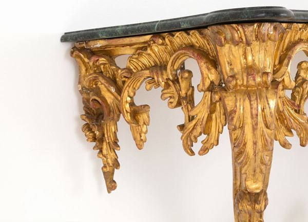 Consolle da muro in legno intagliato e dorato con piano in marmo verde Alpi. Fine XIX secolo. Difetti e mancanze.