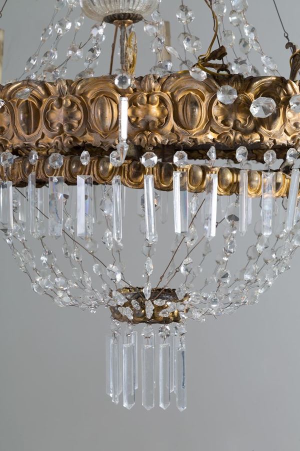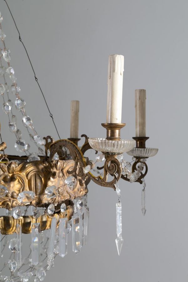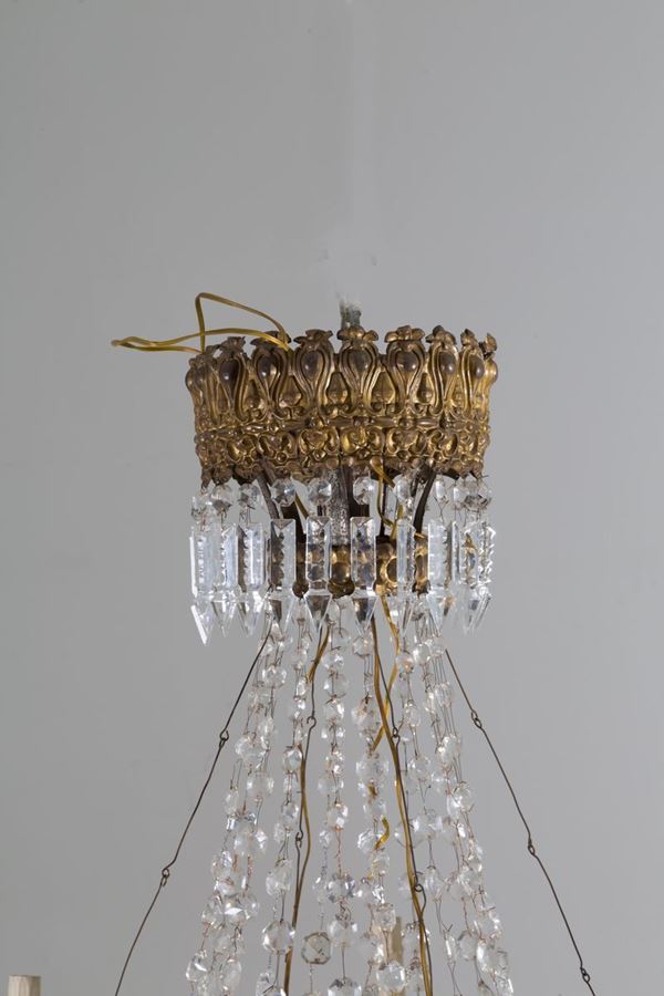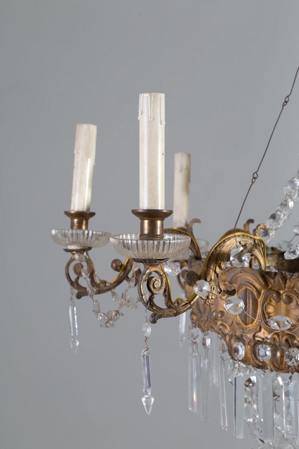 Lampadario otto bracci in lamierino sbalzato e dorato con pendenti e gocce in vetro molato. Toscana. Inizi XIX secolo. Difetti e mancanze.