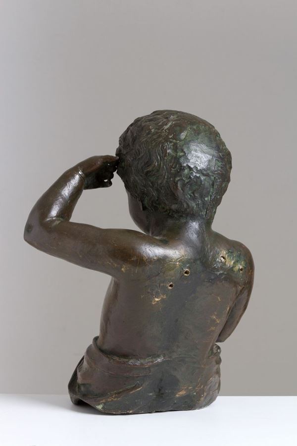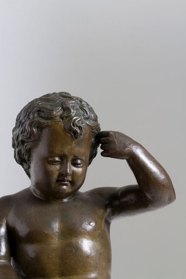 Scultura in bronzo patinato raff. ''PUTTO SEDUTO''. XIX secolo.