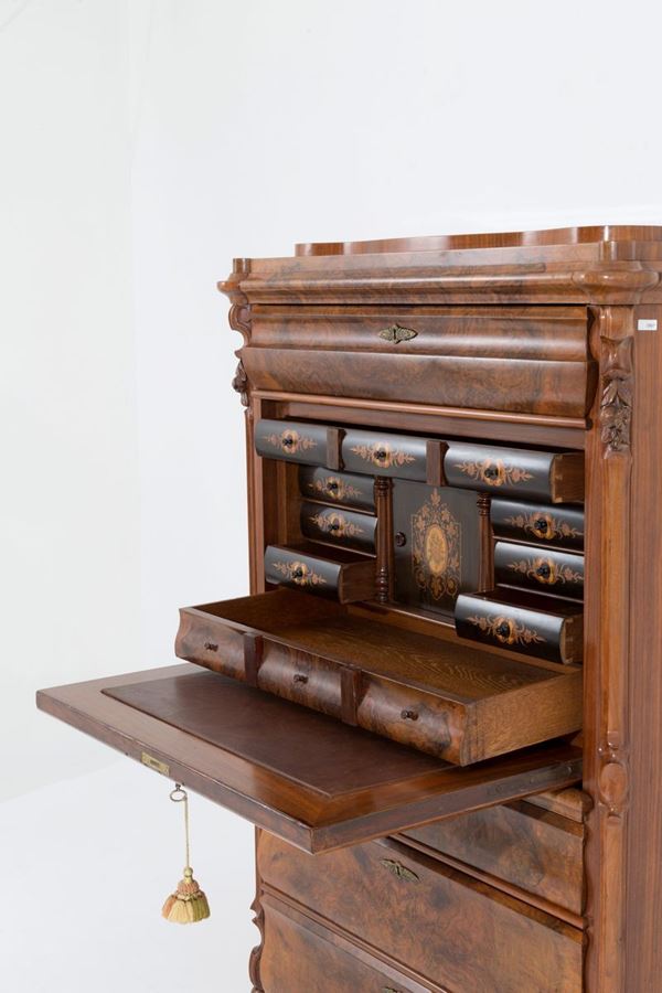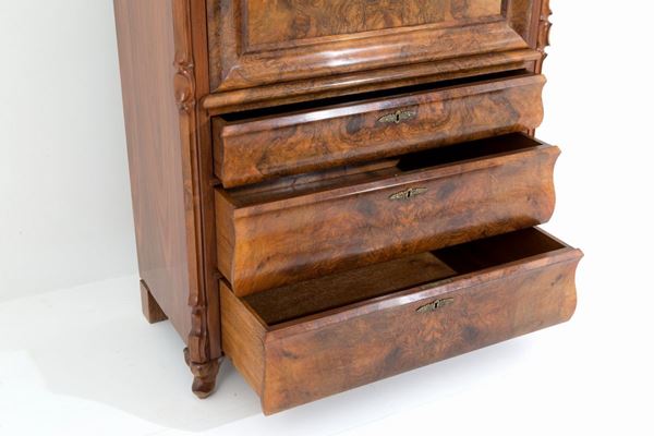 Secretaire lastronato in legni vari con lesene intagliate a motivi di frutta. XIX secolo.