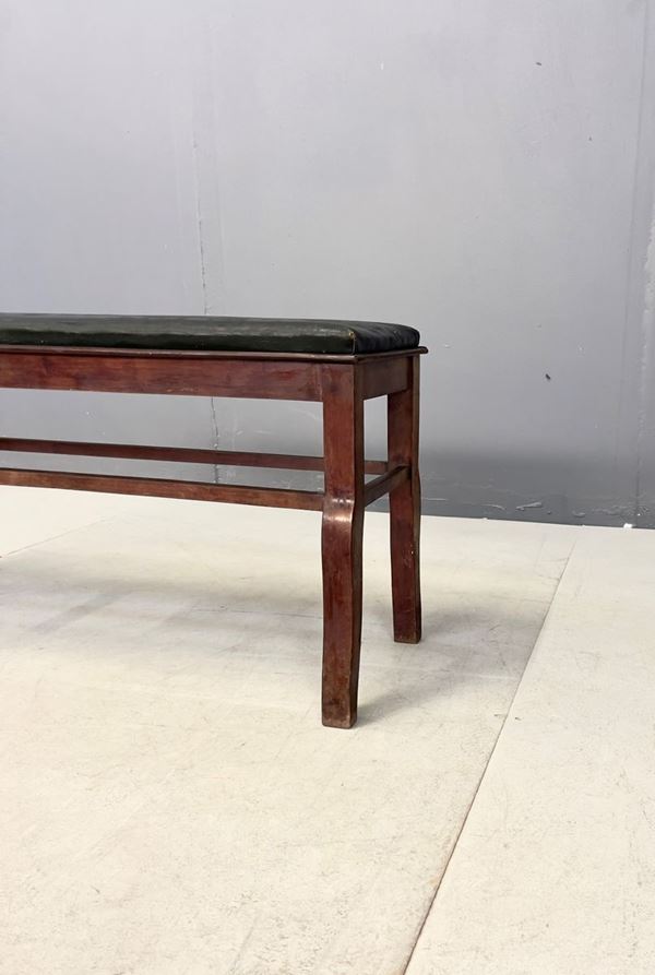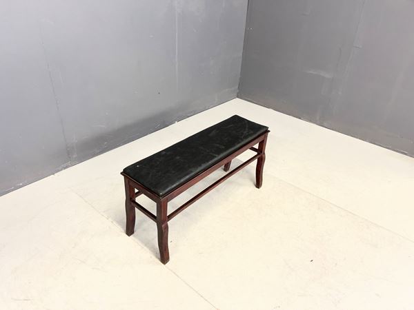 Bench in walnut wood with seat in black sky. Italian manufacture. 1950s. Signs of wear.