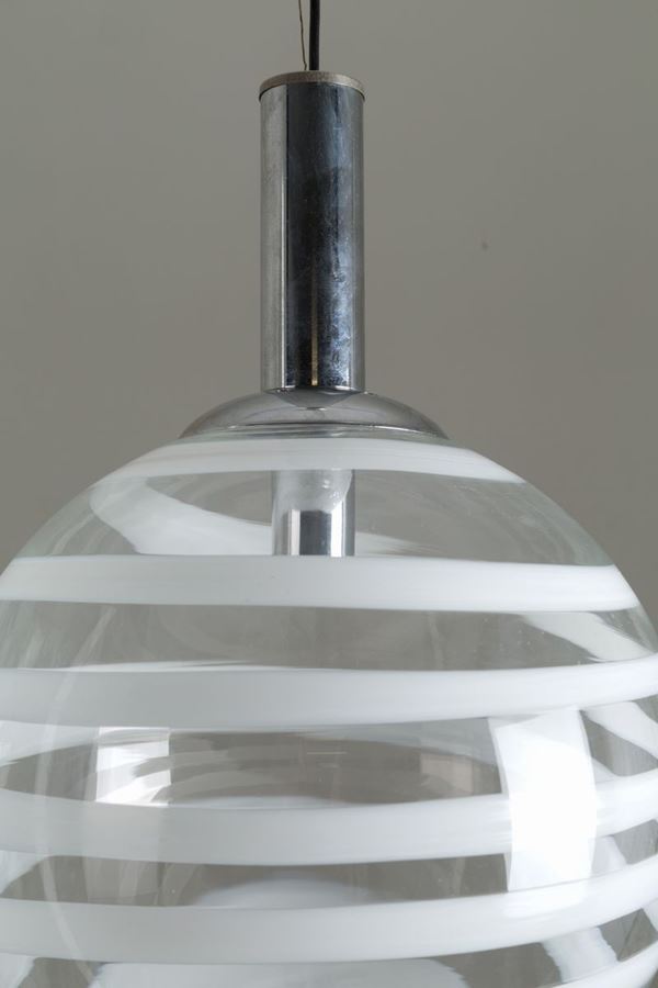 Murano glass chandelier with white spiral on transparent glass and chromed metal. MAZZEGA production. 70's.