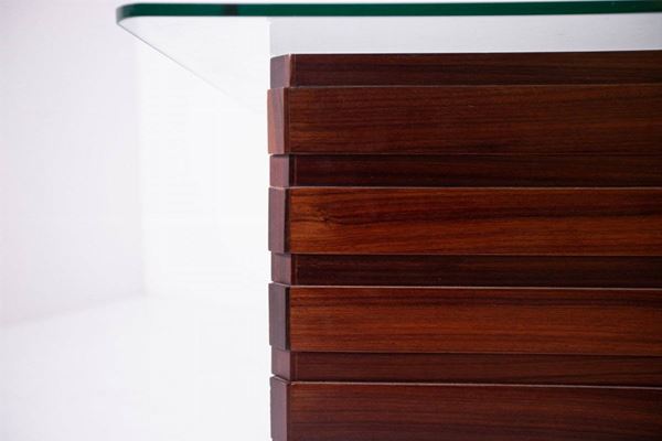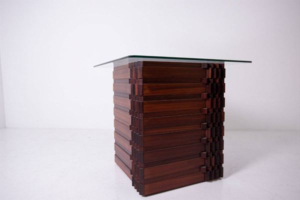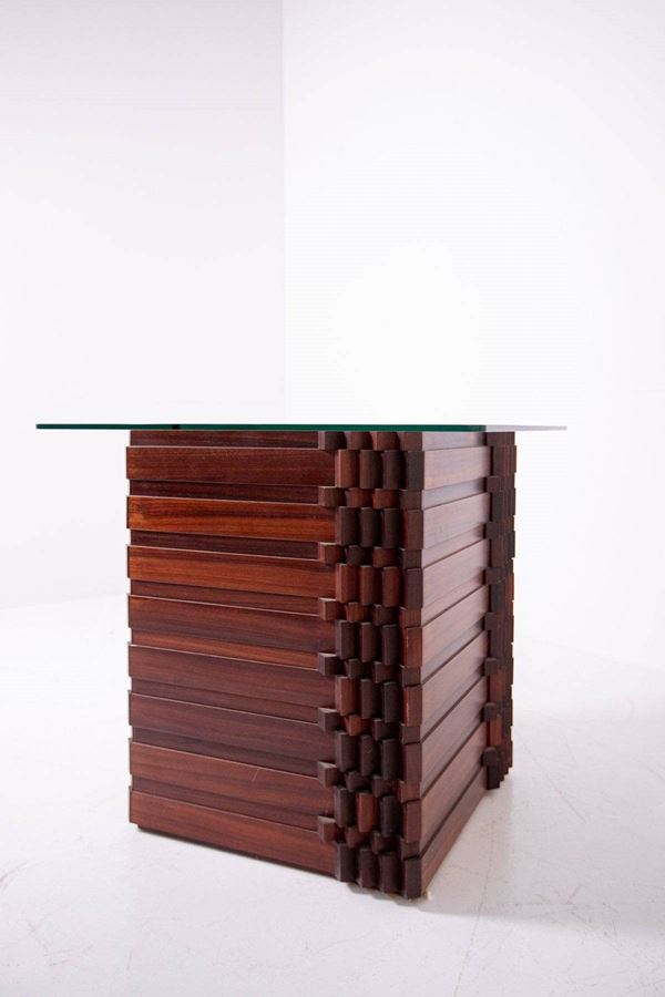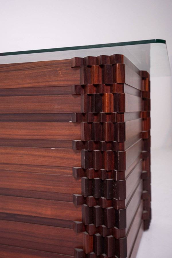 Diamante sculpture-table in precious laminated and solid wood with glass top. Production FRIGERIO DI DESIO. 70's.