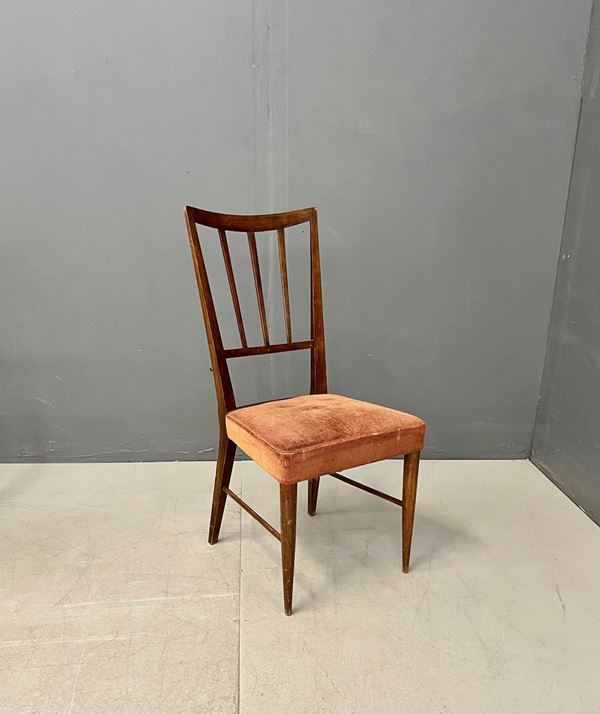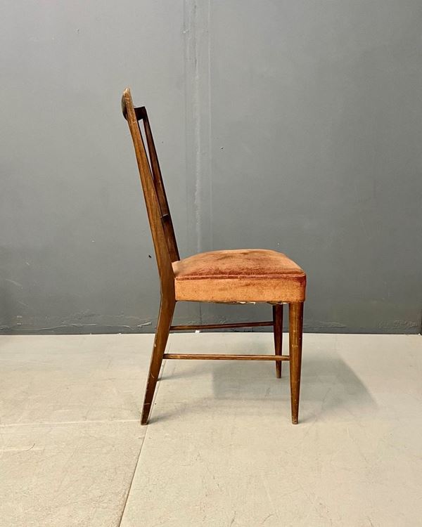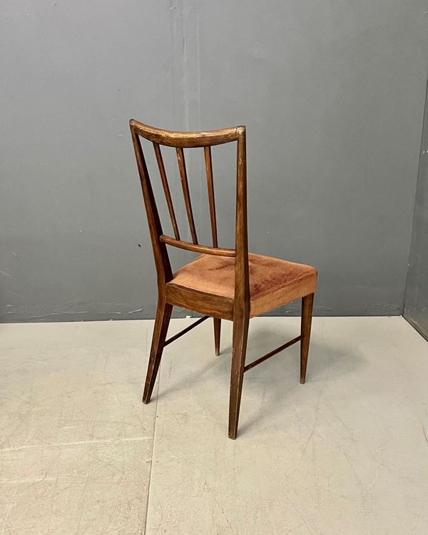 Eight wooden chairs and velvet seat. 1950s. Signs of wear.