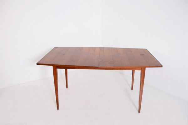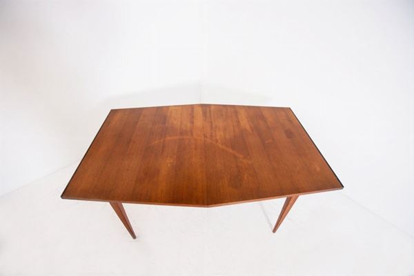 Extendable dining table in wood and brass. American manufacture. 1950s.